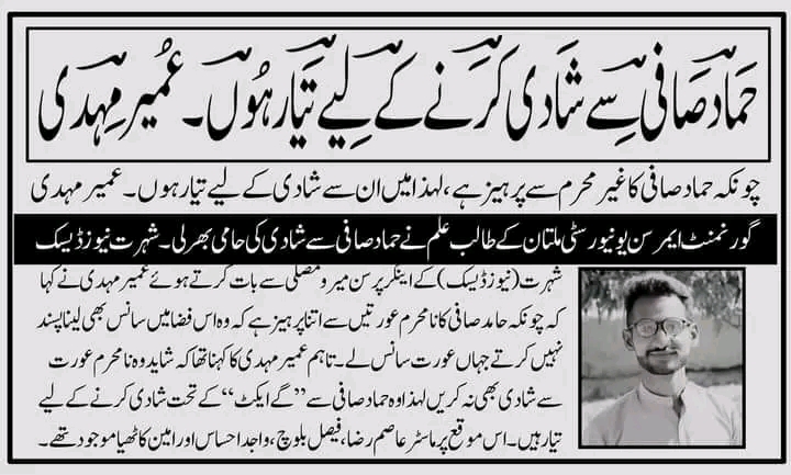 گزشتہ دو تین روز سے سوشل میڈیا پر ایک پوسٹ وائرل ہو رہی تھی کہ عمیر مہدی نامی نوجوان نے حماد صافی سے شادی کرنے کی پیشکش کی ہے ، پوسٹ میں کہا گیا تھا کہ چونکہ حماد صافی کا غیر محرم سے پرہیز ہے لہذا میں ان سے شادی کرنے کے لیے تیار ہوں ۔