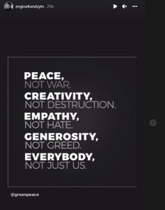 سماجی رابطے کی ویب سائٹ انسٹا گرام پر ترک اداکار انگین التان دوزیتان نے اپنی اسٹوری پر لکھا کہ ”جنگ نہیں امن، تباہی نہیں تخلیقی صلاحیت، نفرت نہیں ہمدردی، لالچ نہیں سخاوت، صرف ہمارے لیے نہیں بلکہ دنیا میں سب کے لیے”