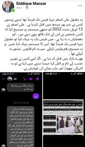 علی اصغر کے قتل کے خلاف آوازیں بلند کی جارہی ہیں، سوشل میڈیا ایکٹوسٹ، شاعر صدیق منظر ایڈوکیٹ نے اپنی ایک پوسٹ بتایا ہے کہ ” مقتول علی اصغر میرا فیس بک فرینڈ تھا جسے پرسوں کسی نے سندھ میں قتل کردیا ہے ۔ علی اصغر نے 12 اپریل سنہء 2022 کو مجھے میسنجر پر میسج کیا کہ کسی شخص نے اس کے ایک لاکھ روپے دینے ہیں ۔ اور دھمکیاں دے رہا ہے ۔ میں فیس بک پہ چیک کیا تو مقتول میرا فیس بک فرینڈ تھا۔ اس کا میسنجر چیک کیا جس پر یہ میسیج رقم واپس کیلئے میرے نام قانونی مشورے کیلئے تھا ۔ بھرے بازار میں قتل کر دیا ہے ۔”